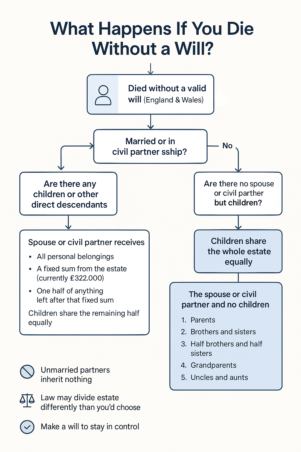 Dying without a valid will is called dying intestate. In that case, your estate is shared out using a strict legal order. Your personal wishes, promises and understandings within the family are not taken into account. The rules vary across the United Kingdom. The outline below is for England and Wales.